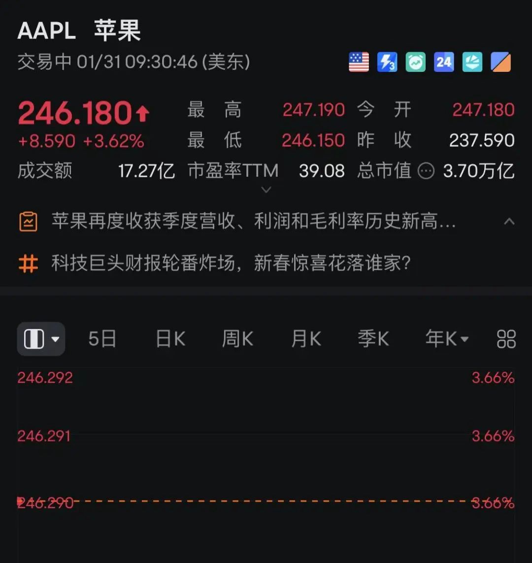 苹果四季度营收1243亿美元,分析师预期1241亿美元。iPhone收入691.4亿美元,预期710亿美元。第四季度大中华区净销售额为185.1亿美元,低于市场预期的213.3亿美元。上年同期为208.19亿美元。