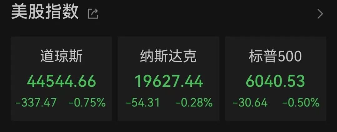 最终,美国三大股指全线收跌,道指跌0.75%报44544.66点,标普500指数跌0.5%报6040.53点,纳指跌0.28%报19627.44点。