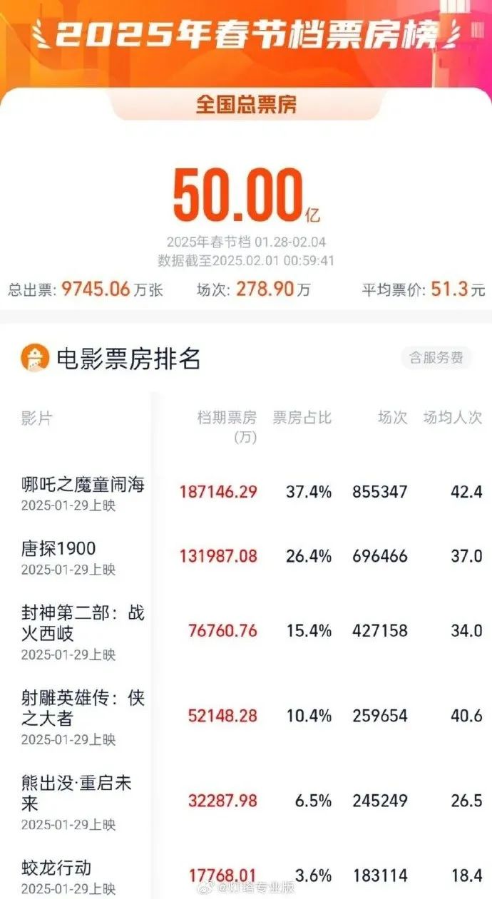 据灯塔专业版,截至2月1日0时59分,2025年春节档(1月28日—2月4日)档期总票房(含预售)突破50亿元!《哪吒之魔童闹海》《唐探1900》《封神第二部:战火西岐》分列春节档票房榜前三位。