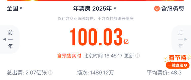 在春节档助力下,2月3日16时45分,我国2025年度总票房正式超过100亿元,已超北美票房成绩,位居全球单一票房市场冠军。另外,2025年度观影总人次已突破2亿。
