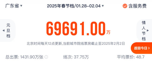 其中,广东省2025年春节档总票房累计已突破6.96亿元,总放映场次超37.7万,总观影人次超1430万,仅次于江苏省,位居全国第二。
