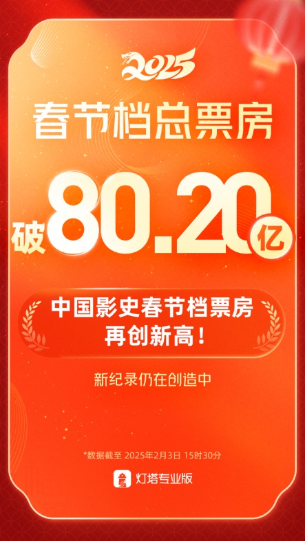 据灯塔专业版,截至2月3日15时30分,2025年春节档(1月28日-2月4日)总票房(含预售)突破80.20亿元,刷新中国影史春节档票房纪录。