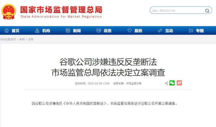 据市场监管总局官网消息,因谷歌公司涉嫌违反《中华人民共和国反垄断法》,市场监管总局依法对谷歌公司开展立案调查。