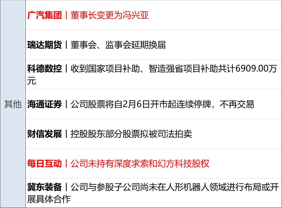 广汽集团(SH601238,股价8.6元,市值887.1亿元):2月4日下午,广汽集团公告,公司董事会收到曾庆洪送达的《辞职函》。曾庆洪因到龄退休,申请辞去公司董事长、董事、董事会战略委员会主任委员及委员职务,并确认与公司及董事会无任何意见分歧,亦无任何与辞任上述职务须提请公司股东注意的事项。