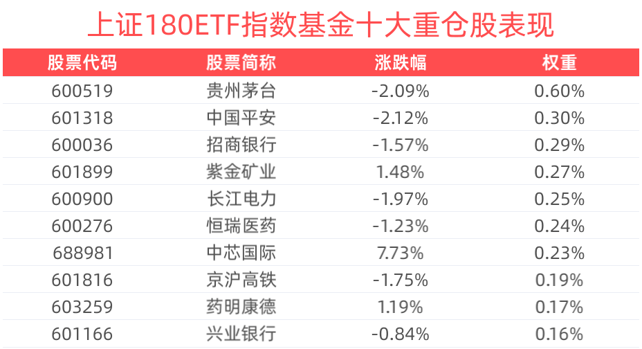数据显示,截至2025年1月27日,上证180指数(000010)前十大权重股分别为贵州茅台(600519)、中国平安(601318)、招商银行(600036)、紫金矿业(601899)、恒瑞医药(600276)、长江电力(600900)、中芯国际(688981)、京沪高铁(601816)、药明康德(603259)、兴业银行(601166),前十大权重股合计占比24.28%。
