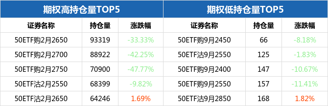 从持仓量来看,50ETF期权合约中,50ETF购2月2650持仓量最大,为93319张,期权全日下跌33.33%,报收0.0278元;持仓量最小的为50ETF购9月2450,共计66张,期权全日下跌8.18%,报收0.2739元。