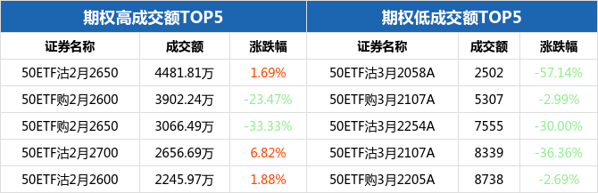 从成交额来看,50ETF期权合约中,50ETF沽2月2650成交额最高,为4481.81万元,全日上涨1.69%,报收0.0601元;而最低的为50ETF沽3月2058A,成交额为2502元,全日下跌57.14%,报收0.0003元。