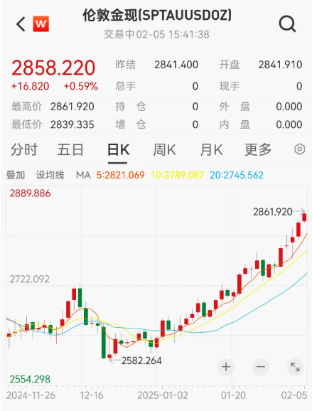 截至记者发稿,伦敦现货黄金报2858.22美元/盎司,本交易日内一度触及2861.9美元/盎司的高点,续创历史新高。而在线下,实体黄金价格也水涨船高。数据显示,以老凤祥为例,该品牌足金价格2月5日报857元/克,刷新历史纪录,今年以来的累计涨幅超过6%。