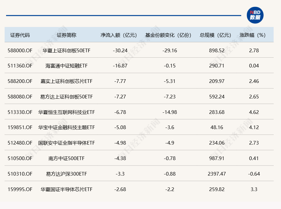 与此同时,华夏上证科创板50ETF基金份额减少29.16亿份,净流出额为30.24亿元;海富通中证短融ETF基金份额减少0.15亿份,净流出额为16.87亿元;嘉实上证科创板芯片ETF基金份额减少5.31亿份,净流出额为7.77亿元。