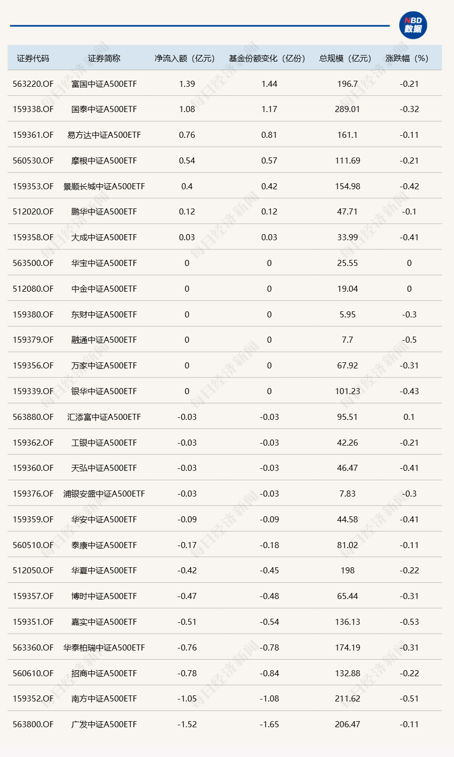 此外,上周五场内26只中证A500ETF合计净流出1.57亿元,其中有7只获得资金增持。