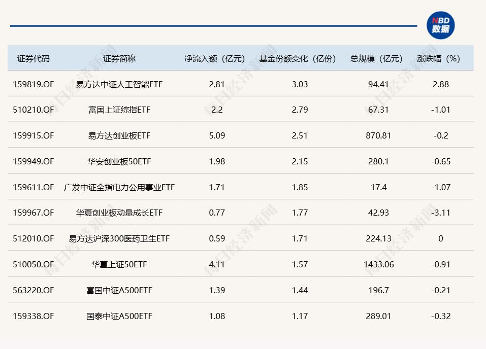 Wind数据显示,在2月5日的非货币ETF市场中,易方达中证人工智能ETF基金份额增加3.03亿份,净流入额为2.81亿元;富国上证综指ETF基金份额增加2.79亿份,净流入额为2.2亿元;易方达创业板ETF基金份额增加2.51亿份,净流入额为5.09亿元。