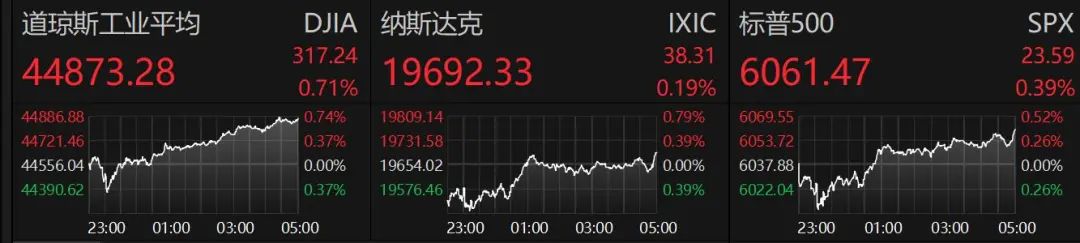 美股低开高走,三大指数集体收涨,道指涨0.71%,标普500指数涨0.39%,纳指涨0.19%。