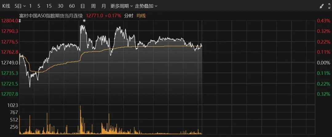 富时A50期指连续夜盘收涨0.17%,报12771点。