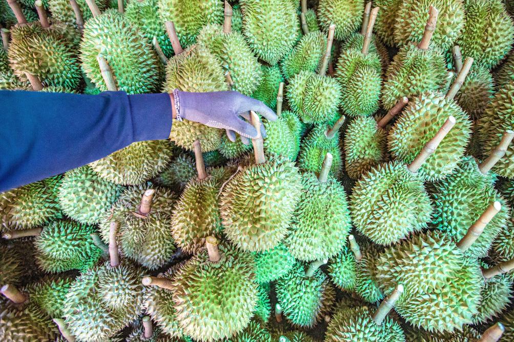 2024年4月26日,在泰国尖竹汶府,工人在榴莲园码放榴莲。新华社记者王腾摄