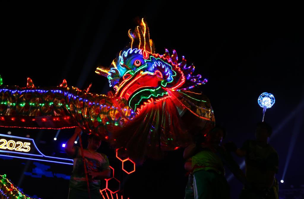 1月26日,演员在泰国那空沙旺湄南河畔举行的春节庆祝活动上表演舞龙。新华社记者孙玮彤摄