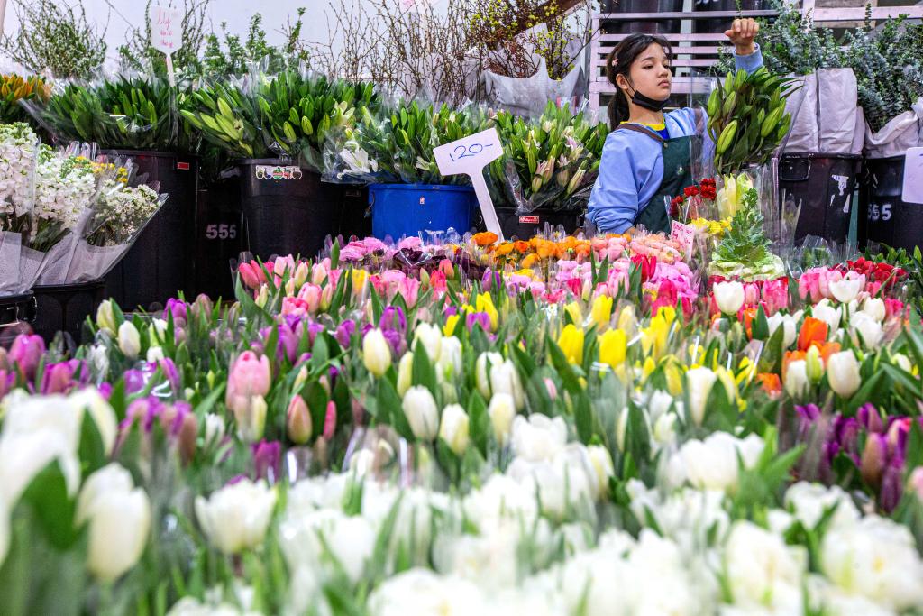 2023年2月21日,工作人员在泰国曼谷帕空鲜花市场包装来自云南的鲜花。新华社记者王腾摄