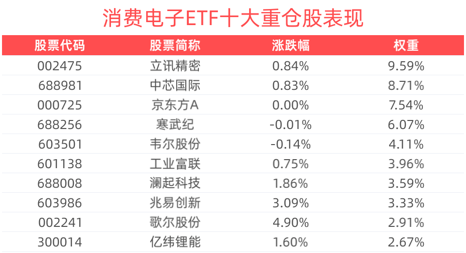 数据显示,截至2025年1月27日,中证消费电子主题指数(931494)前十大权重股分别为立讯精密(002475)、中芯国际(688981)、京东方A(000725)、寒武纪(688256)、韦尔股份(603501)、工业富联(601138)、兆易创新(603986)、澜起科技(688008)、歌尔股份(002241)、长电科技(600584),前十大权重股合计占比53.44%。