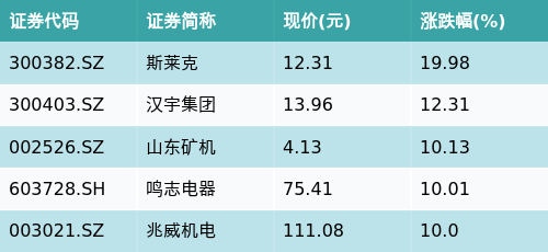 截至午间收盘,机器人概念主题涨跌幅最高的五只股票为:斯莱克(300382.SZ)、汉宇集团(300403.SZ)、山东矿机(002526.SZ)、鸣志电器(603728.SH)与兆威机电(003021.SZ)。详情见下表: