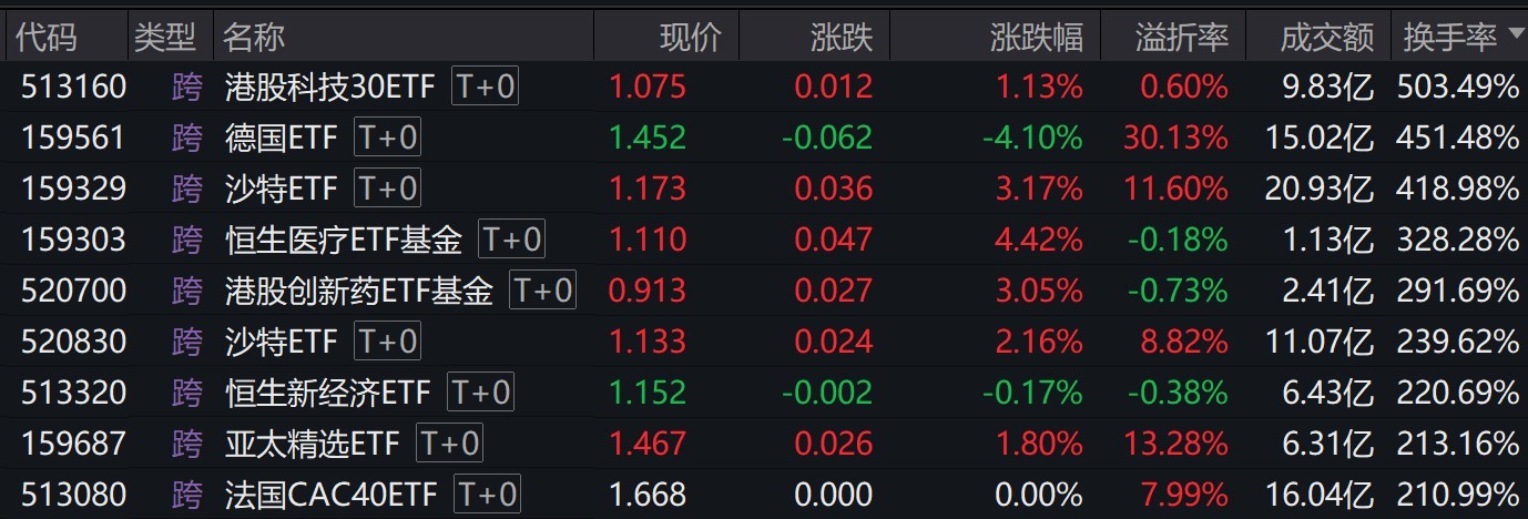 截至上午收盘,9只ETF换手率超200%,均为跨境ETF。