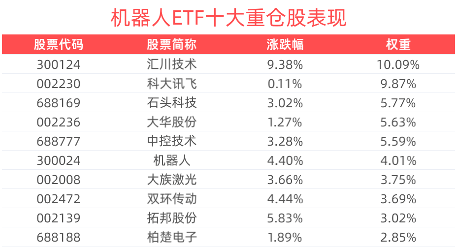 数据显示,截至2025年1月27日,中证机器人指数(H30590)前十大权重股分别为汇川技术(300124)、科大讯飞(002230)、石头科技(688169)、中控技术(688777)、大华股份(002236)、双环传动(002472)、机器人(300024)、大族激光(002008)、拓邦股份(002139)、柏楚电子(688188),前十大权重股合计占比53.36%。