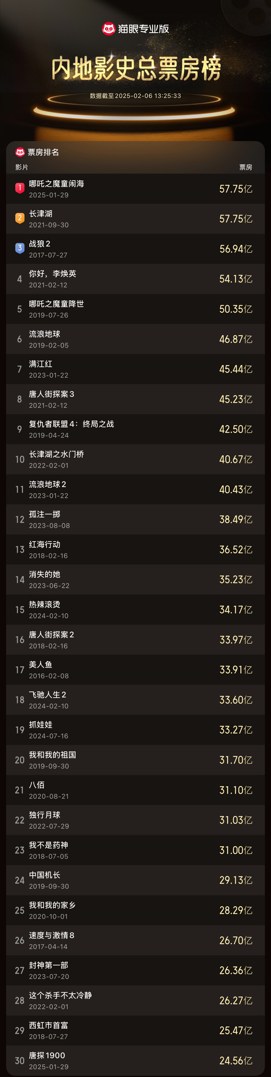 哪吒登顶!据猫眼专业版数据,截至2月6日,电影《哪吒之魔童闹海》累计票房突破57.76亿元,超《长津湖》票房成绩,仅用8天5小时登顶中国影史票房榜。