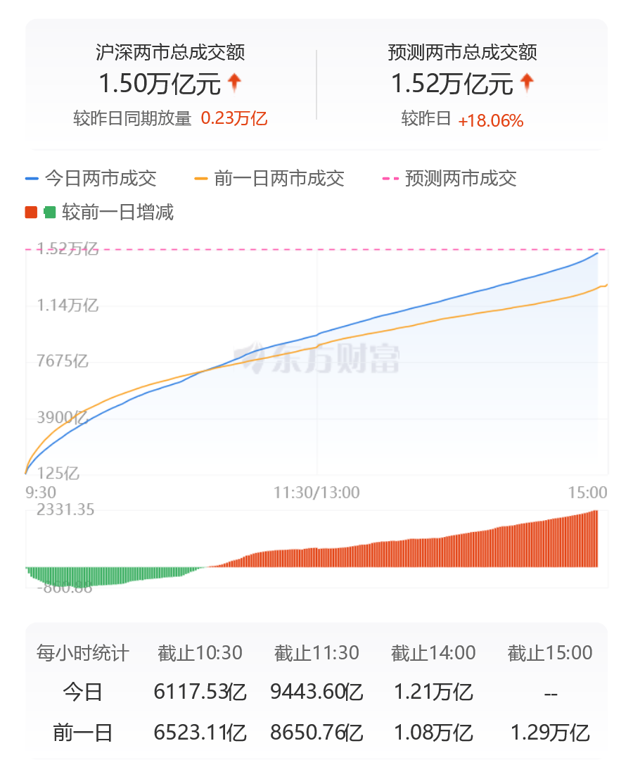 沪深两市成交额突破1.5万亿元。