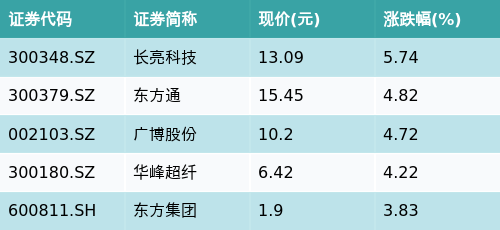 截至收盘,跨境支付(CIPS)主题涨跌幅最高的五只股票为:长亮科技(300348.SZ)、东方通(300379.SZ)、广博股份(002103.SZ)、华峰超纤(300180.SZ)与东方集团(600811.SH)。详情见下表: