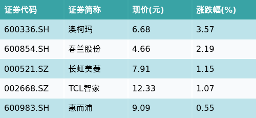 截至收盘,白色家电主题涨跌幅最高的五只股票为:澳柯玛(600336.SH)、春兰股份(600854.SH)、长虹美菱(000521.SZ)、TCL智家(002668.SZ)与惠而浦(600983.SH)。详情见下表: