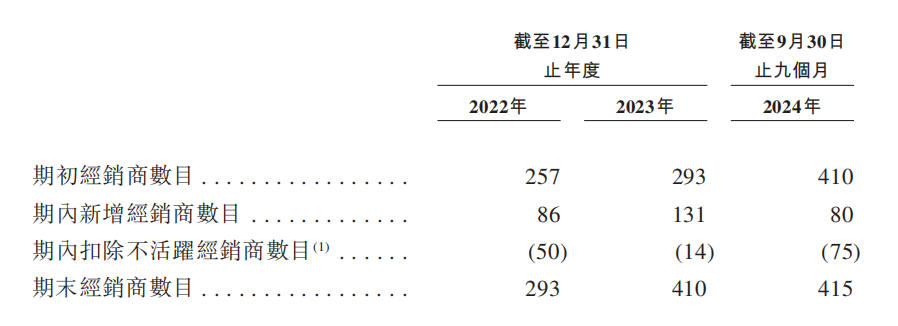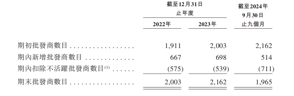 而且,批发商终止合作的比例在飙升。2022-2023年及2024年三季度末,乐舒适分别拥有2003名、2162名及1965名批发商;不活跃批发商分别为575家、539家以及711家,可以看出不活跃的批发商数目在逐渐增加。2024年前9个月,乐舒适新增批发商514家,新增批发商少于不活跃批发商,导致批发商数量显示为净减少。乐舒适在招股书中解释,当某批发商在相关年度或期间并未为公司收入作出贡献时,即认为该批发商不活跃也就是终止合作关系。