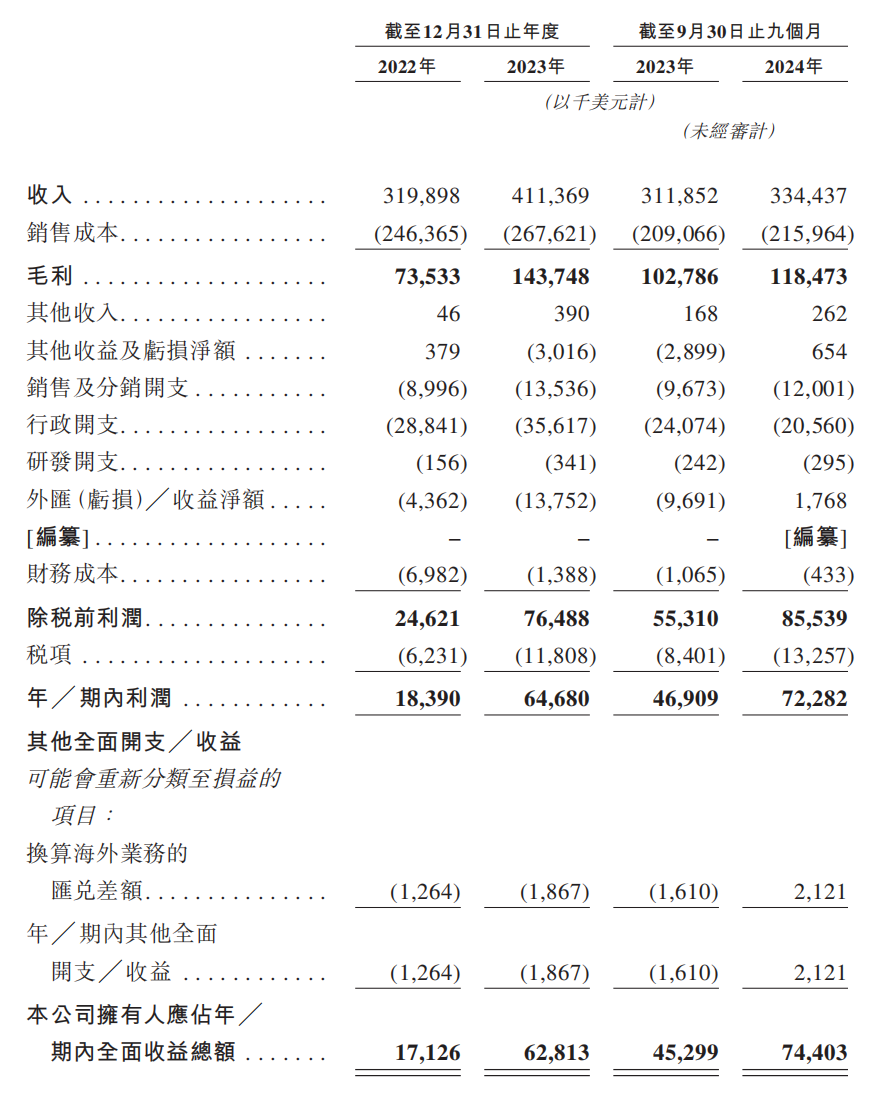 乐舒适营收随市场需求增长而稳步攀升,其收入由2022年的3.2亿美元增长28.6%至2023年的4.1亿美元。2024年前三季度,公司收入为3.3亿美元,同比增加7.2%。招股书披露其收入增长是由于提高在现有非洲市场的渗透率,同时借助品牌知名度及广泛的销售网络将业务扩展至拉丁美洲及中亚。