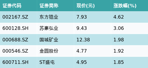 截至收盘,黄金概念主题涨跌幅最高的五只股票为:东方锆业(002167.SZ)、苏豪弘业(600128.SH)、国城矿业(000688.SZ)、金圆股份(000546.SZ)与ST盛屯(600711.SH)。详情见下表: