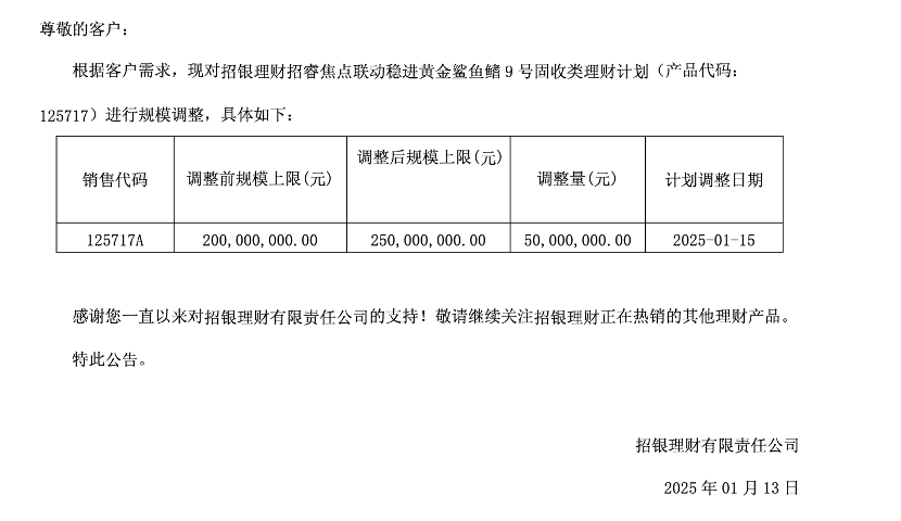 例如,近日招银理财发布公告称,根据客户需求,将“招睿焦点联动稳进黄金鲨鱼鳍9号固收类理财计划”的发行规模上限,由2亿元上调至2.5亿元。该产品目前已完成募集。