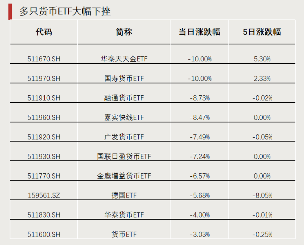 多只货币ETF大幅下挫,华泰天天金ETF、国寿货币ETF罕见出现10%跌停。