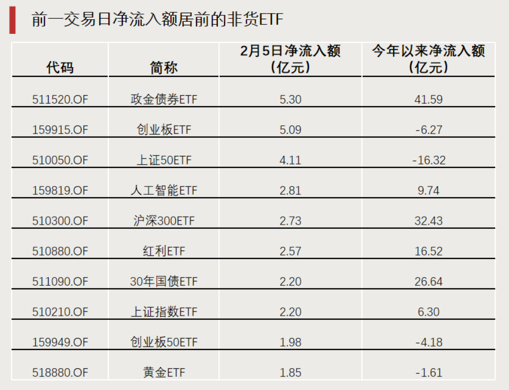前一交易日,多只宽基ETF获资金净流入,其中政金债券ETF净流入额达5.30亿元,位列非货ETF之首。行业ETF方面,人工智能ETF、红利ETF、黄金ETF也获资金净流入。