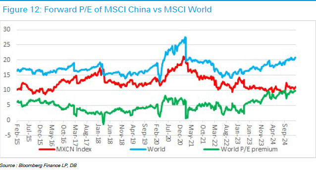 研报最后总结称,如果将沪深300指数与纳指进行比较,可以发现美国的净资产收益率是中国的两倍,但投资者支付的金额是账面价值的四倍。如果再看MSCI中国指数,其市盈率比MSCI全球指数低了10个点——非常接近其估值区间的低端。