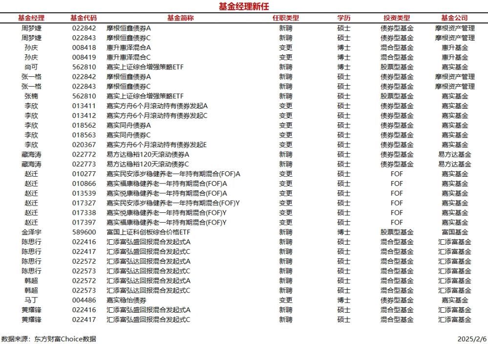 南方财经2月6日电,据东方财富Choice数据统计,今日新聘基金经理13人,涉及24只基金(A/C类分开计算),主要来自嘉实基金、汇添富基金等公司。另外,今日有6位基金经理离任。