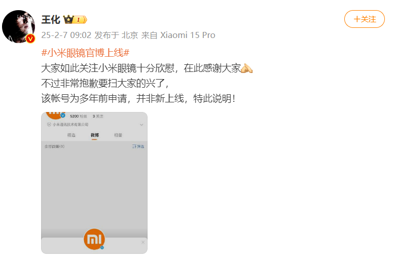 小米集团公关部总经理王化回应“小米眼镜官博上线”:帐号为多年前申请,并非新上线