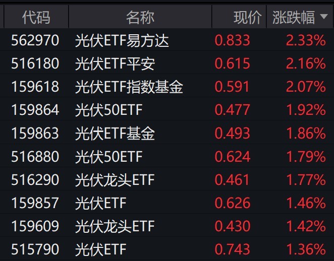 受盘面影响,多只跟踪中证光伏产业指数的ETF涨逾2%。