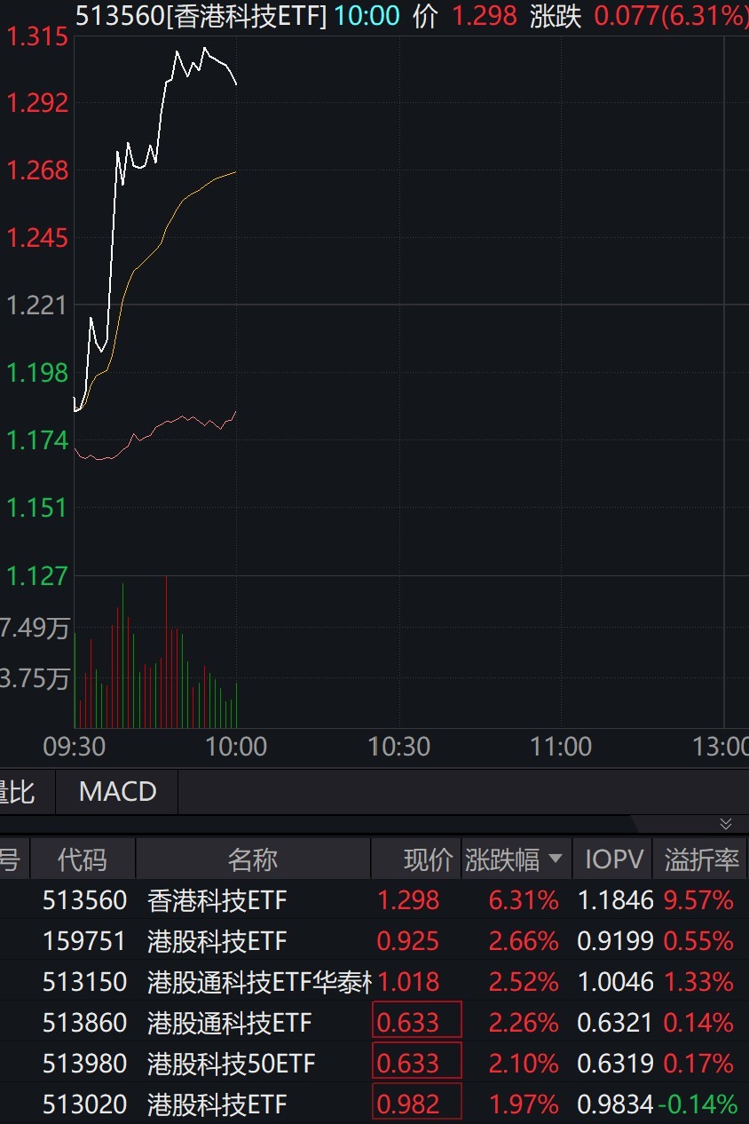 港股早盘持续走强,香港科技ETF涨超6%,溢价近10%