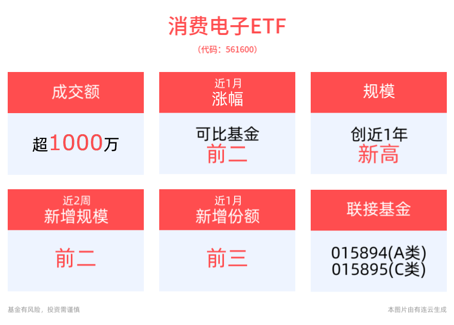 份额方面,消费电子ETF近1月份额增长1100.00万份,实现显著增长,新增份额位居可比基金3/7。