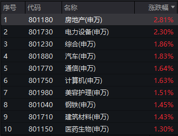 电力设备、汽车、通信、计算机等板块涨幅靠前。