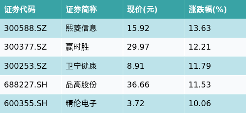 截至午间收盘,国产软件主题涨跌幅最高的五只股票为:熙菱信息(300588.SZ)、赢时胜(300377.SZ)、卫宁健康(300253.SZ)、品高股份(688227.SH)与精伦电子(600355.SH)。详情见下表:
