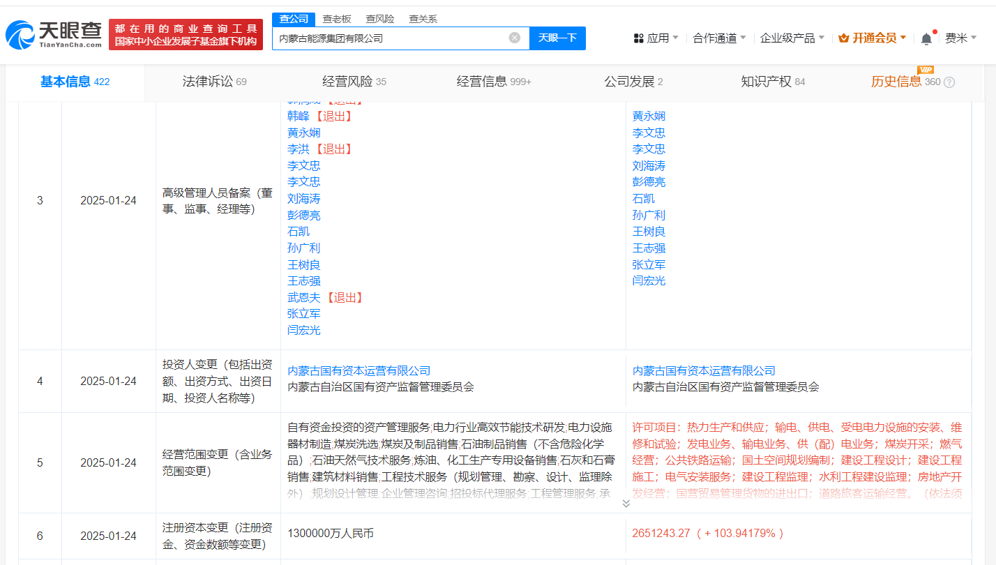南方财经2月7日电,天眼查App显示,近日,内蒙古能源集团有限公司发生工商变更,注册资本由130亿人民币增至约265.1亿人民币,增幅约104%,同时多位高管发生变更。该公司成立于2006年9月,法定代表人为闫宏光,经营范围含热力生产和供应、煤炭开采、燃气经营、公共铁路运输、建设工程施工、电气安装服务等,由内蒙古自治区人民政府国有资产监督管理委员会、内蒙古国有资本运营有限公司共同持股。