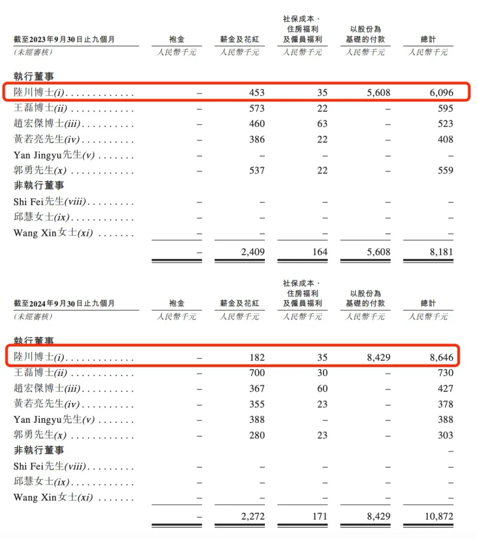 但即便如此,陆川2022-2023年的薪酬仍然是排名第二的王磊博士“薪金及花红”的两倍以上,后者分别为73.8万元和85.9万元。
