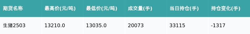 南方财经2月7日电,南财金融终端盘后期货数据显示,大连商品交易所的生猪主力合约收跌1.47%,收盘报13065.0元/吨,日内资金流出5771.15万元。其他相关指标见下表: