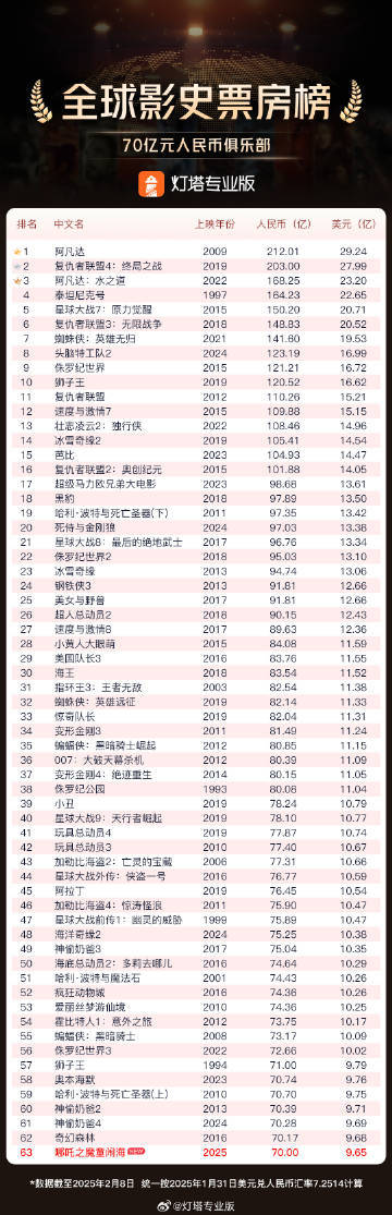 据灯塔专业版,截至2月8日,影片《哪吒之魔童闹海》票房(含预售)突破70亿,成为全球影史第63部票房超过70亿(人民币)的影片,打破70亿人民币票房俱乐部好莱坞影片垄断。