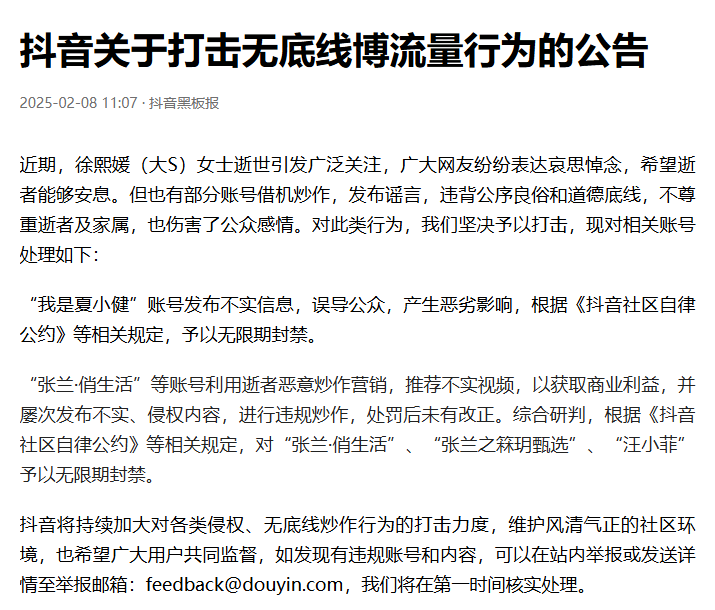 2月8日,抖音黑板报表示,近期,徐熙媛(大S)女士逝世引发广泛关注,广大网友纷纷表达哀思悼念,希望逝者能够安息。但也有部分账号借机炒作,发布谣言,违背公序良俗和道德底线,不尊重逝者及家属,也伤害了公众感情。对此类行为,我们坚决予以打击,现对相关账号处理如下: