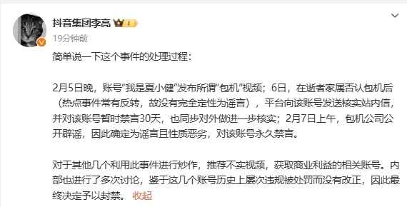 对于上述处罚情况,抖音集团副总裁李亮表示,2月5日晚,账号“我是夏小健”发布所谓“包机”视频;6日,在逝者家属否认包机后(热点事件常有反转,故没有完全定性为谣言),平台向该账号发送核实站内信,并对该账号暂时禁言30天,也同步对外做进一步核实;2月7日上午,包机公司公开辟谣,因此确定为谣言且性质恶劣,对该账号永久禁言。