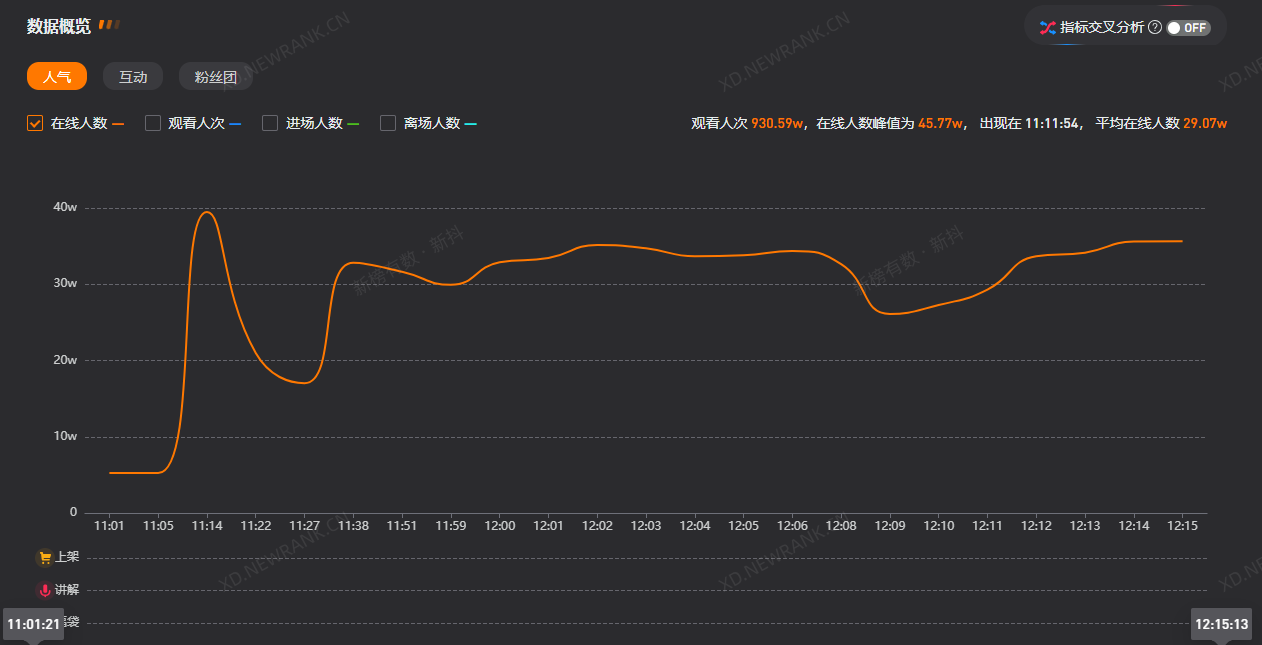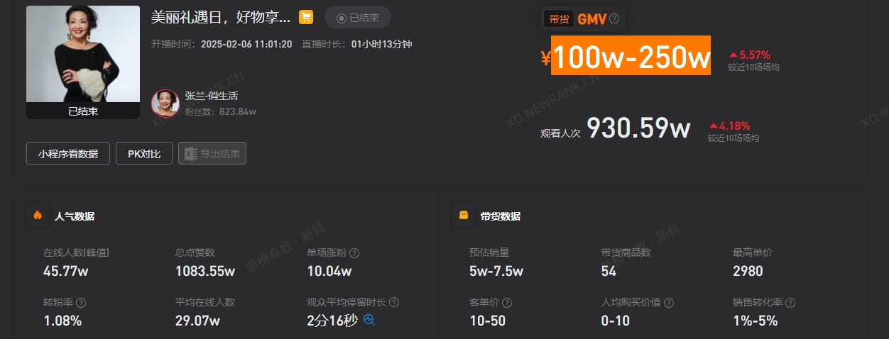 新抖数据显示,2月2日至2月6日,“张兰·俏生活”涨粉约30万,其6日直播带货数据也明显提升,观看人次930.59万,在线人数峰值为45.77万。