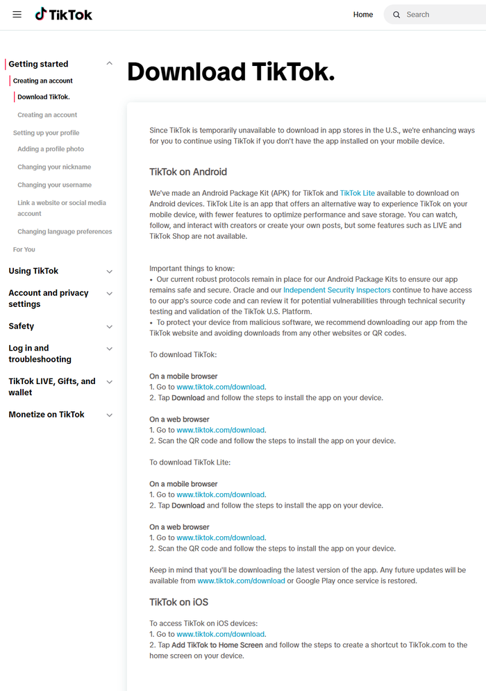 当地时间2月7日,TikTok发布公告称,由于TikTok暂时无法在美国的应用商店中下载,因此为用户制作了一个安卓软件下载包,以供用户在安卓设备上下载软件。用户可以观看、关注、与创作者进行互动或创建自己的帖子,但是某些功能(例如Live和TikTok Shop)不可用。